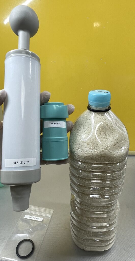米を入れたPETボトルをアダプターを介してポンプで真空排気しながらキャップを締めることで真空保存ができる簡単で安価な商品を開発しました。